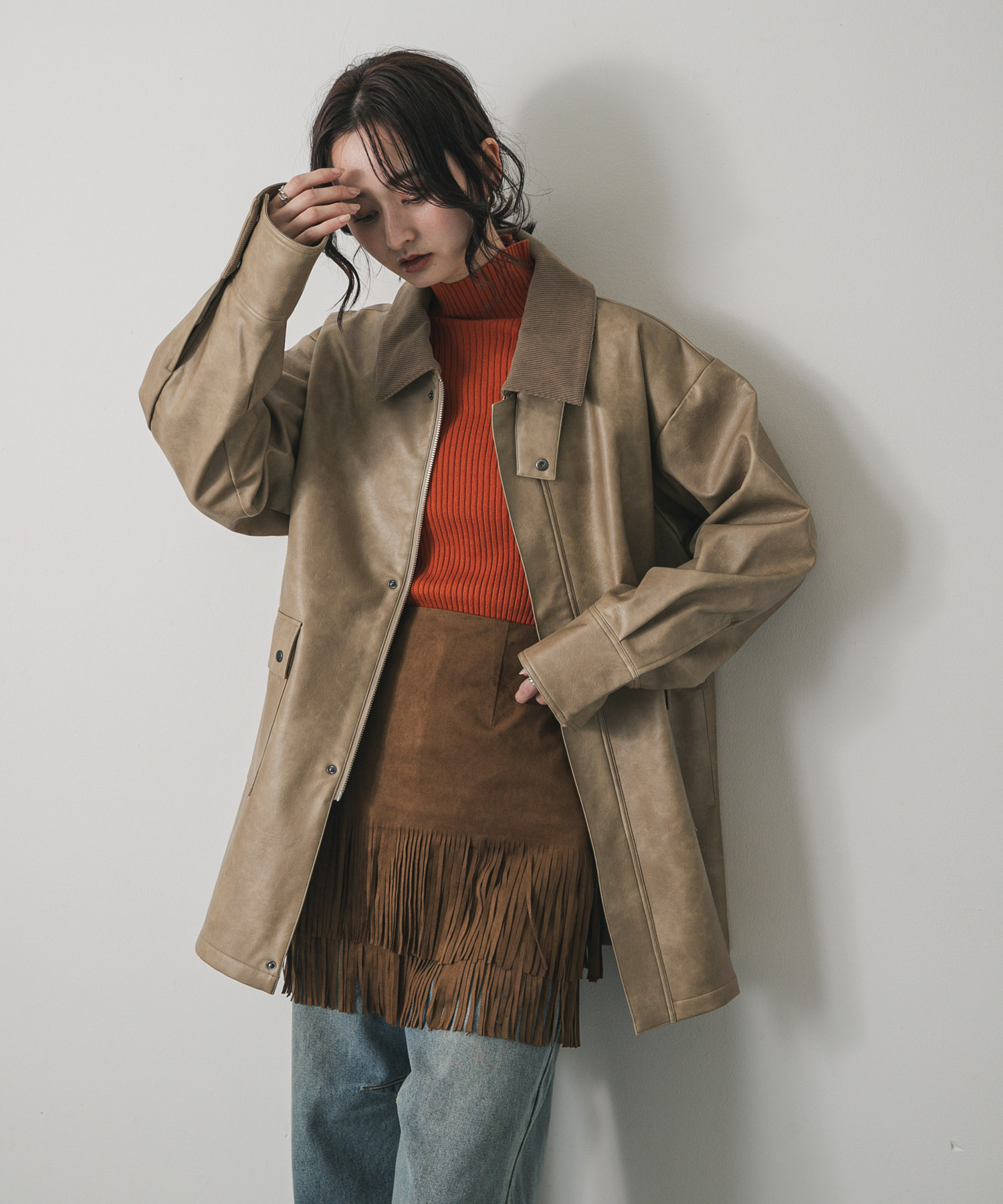 【一件穿出氣勢。摩登感滿分的異材質拼接皮質外套】・仿皮革×燈芯絨異材質拼接,視覺新鮮有型・休閒設計結合皮革質感,營造出摩登穿搭氛圍・袖口可反折,為整體造型增添個性細節以仿皮革打造主體,搭配燈芯絨翻領的異材質拼接設計,展現時尚層次感。雖為休閒輪廓,卻因皮革的質感而更添都會氣息。袖口可依喜好反折,為日常造型帶來更多變化可能。