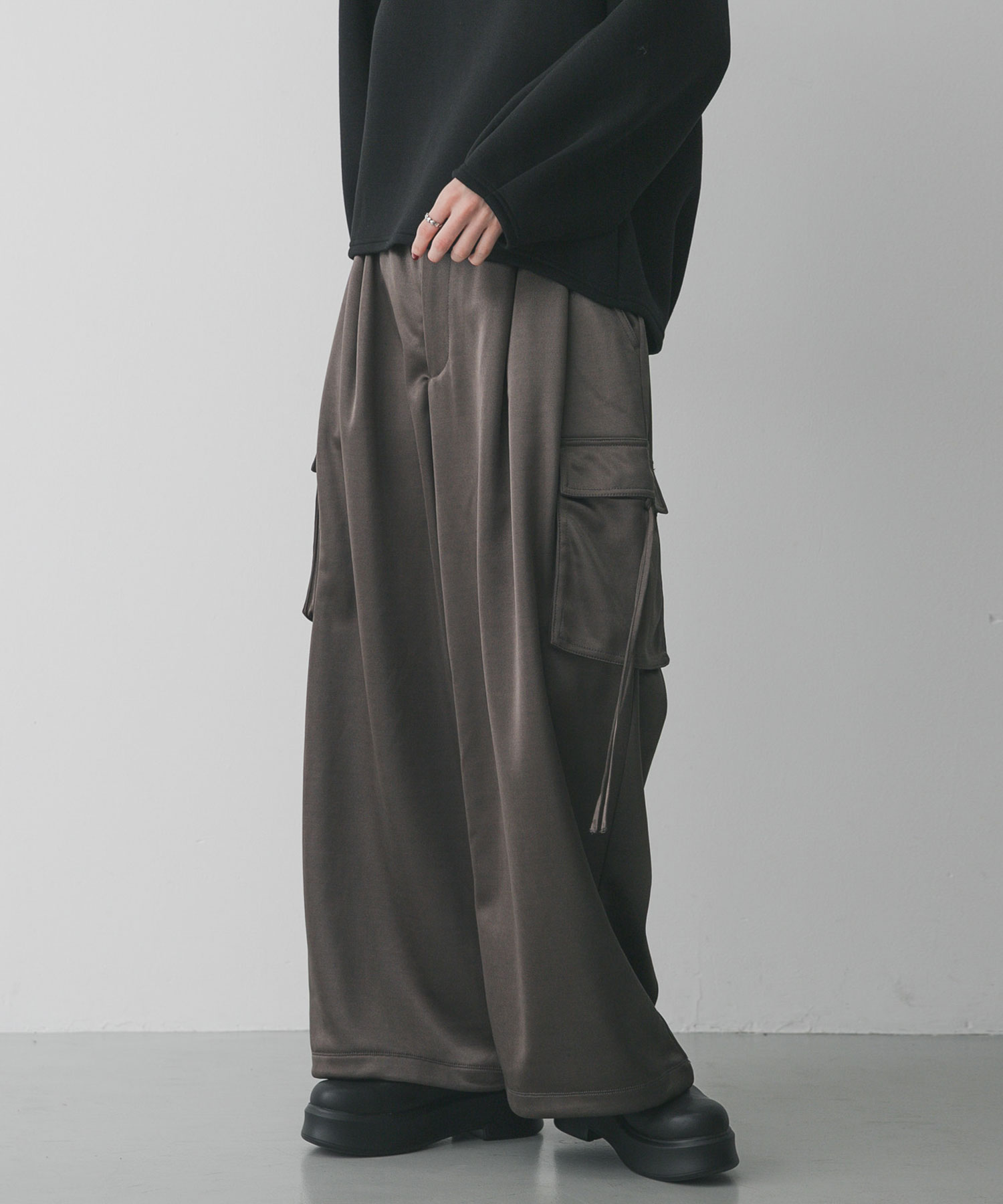 【細緻光澤感・質感緞面工裝長褲】・質感緞面材質,呈現柔和光澤・側邊工裝口袋增添些許設計感・版型俐落不厚重,打造休閒與質感兼具的氛圍這款工裝長褲選用帶有細緻光澤的緞面布料,穿上就能展現優雅而俐落的風格。雖然加入工裝口袋,但透過緞面材質的平衡,整體不會過於休閒,反而更顯精緻。寬鬆挺順的版型穿起來舒適、帶有適度的放鬆感,只要搭配簡單的針織上衣或襯衫,就能輕鬆完成充滿時髦感的造型。
