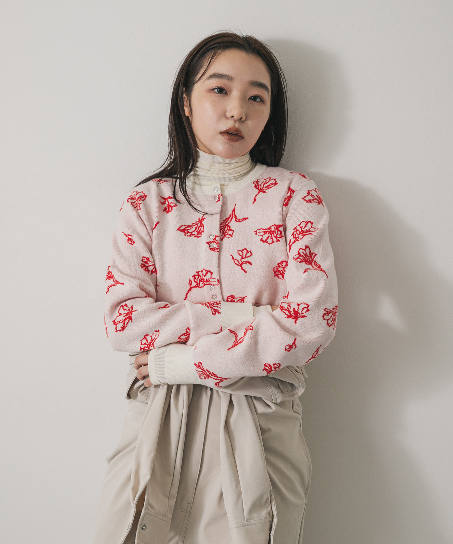 【輕鬆跳脫一成不變。線條花卉圖案設計針織上衣】・蓬鬆柔軟的材質保暖又舒服,外套裡當內搭也無負擔・線條風格的花卉圖案,營造成熟不甜膩的大人休閒感・前排小巧的釦子設計,為造型增添細緻亮點這款針織開襟上衣使用蓬鬆溫暖的材質,觸感柔軟、穿起來非常舒適。以線條勾勒的花卉圖案帶出淡雅的大人感,不會過於可愛,日常穿搭也很好駕馭。略微短版的設計與高腰下身特別合拍,比例視覺更俐落。可將釦子全扣當上衣單穿,也能當成外搭或作為大衣裡的中層穿著,實穿度相當高。