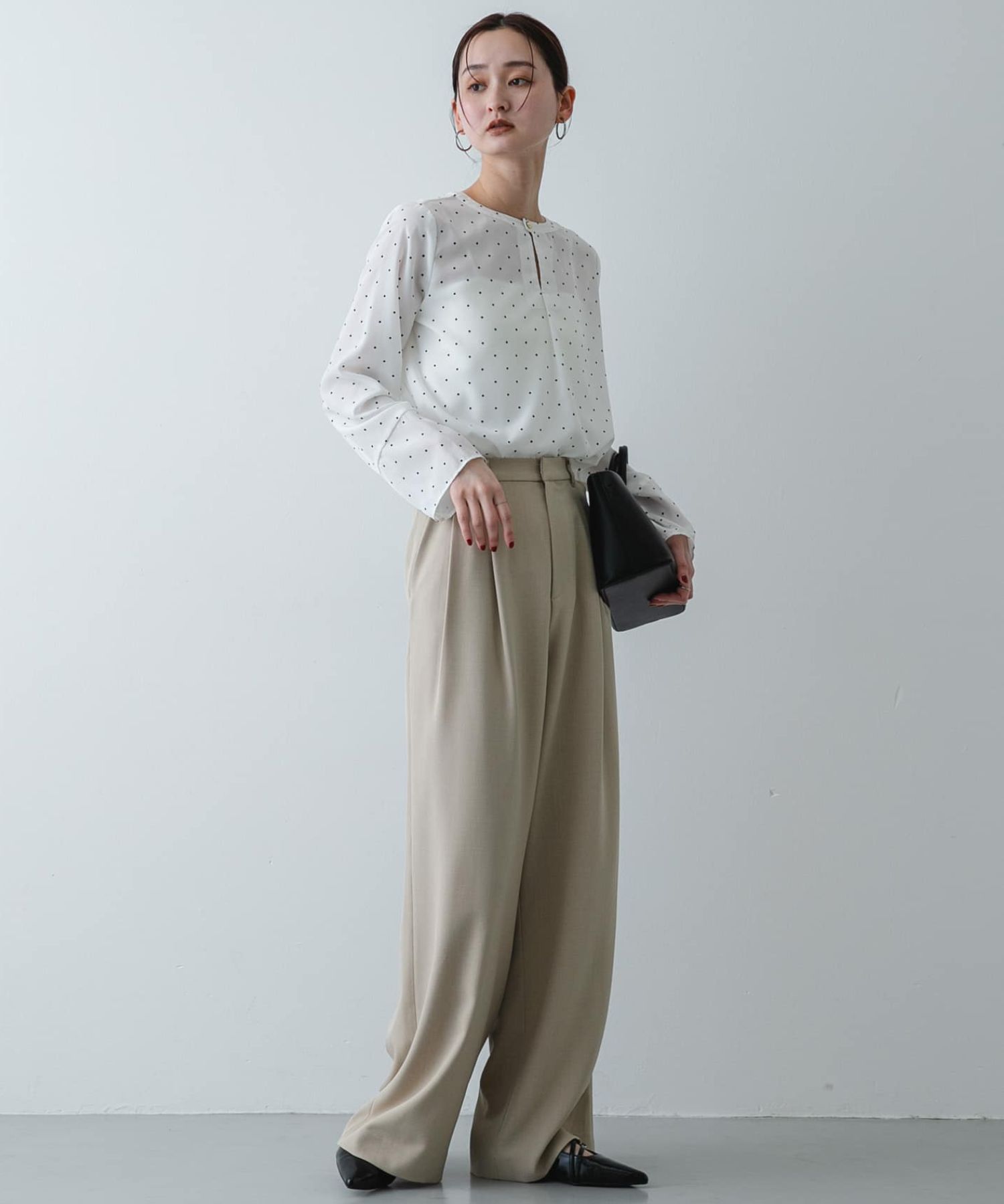 【散發俐落氣質。正式場合也能亮眼登場的點點襯衫】・採用觸感清爽的聚酯纖維材質,整天穿著依然舒適自在・低調點點圖案,為場合或典禮等重要時刻增添優雅亮點・從日常外出到正式場合皆適合的百搭單品細緻的點點圖案為整體造型帶來清爽俐落的氣質,是一款立領設計的襯衫。選用不易起皺的聚酯纖維布料,無論日常穿搭或特別場合都能輕鬆駕馭。領口的立領設計與下擺開衩細節,營造帶有輕盈感的洗練輪廓。不僅適合在典禮等正式場合展現優雅氣質,也能搭配丹寧褲打造輕鬆外出造型,展現自在又不失品味的穿搭風格。