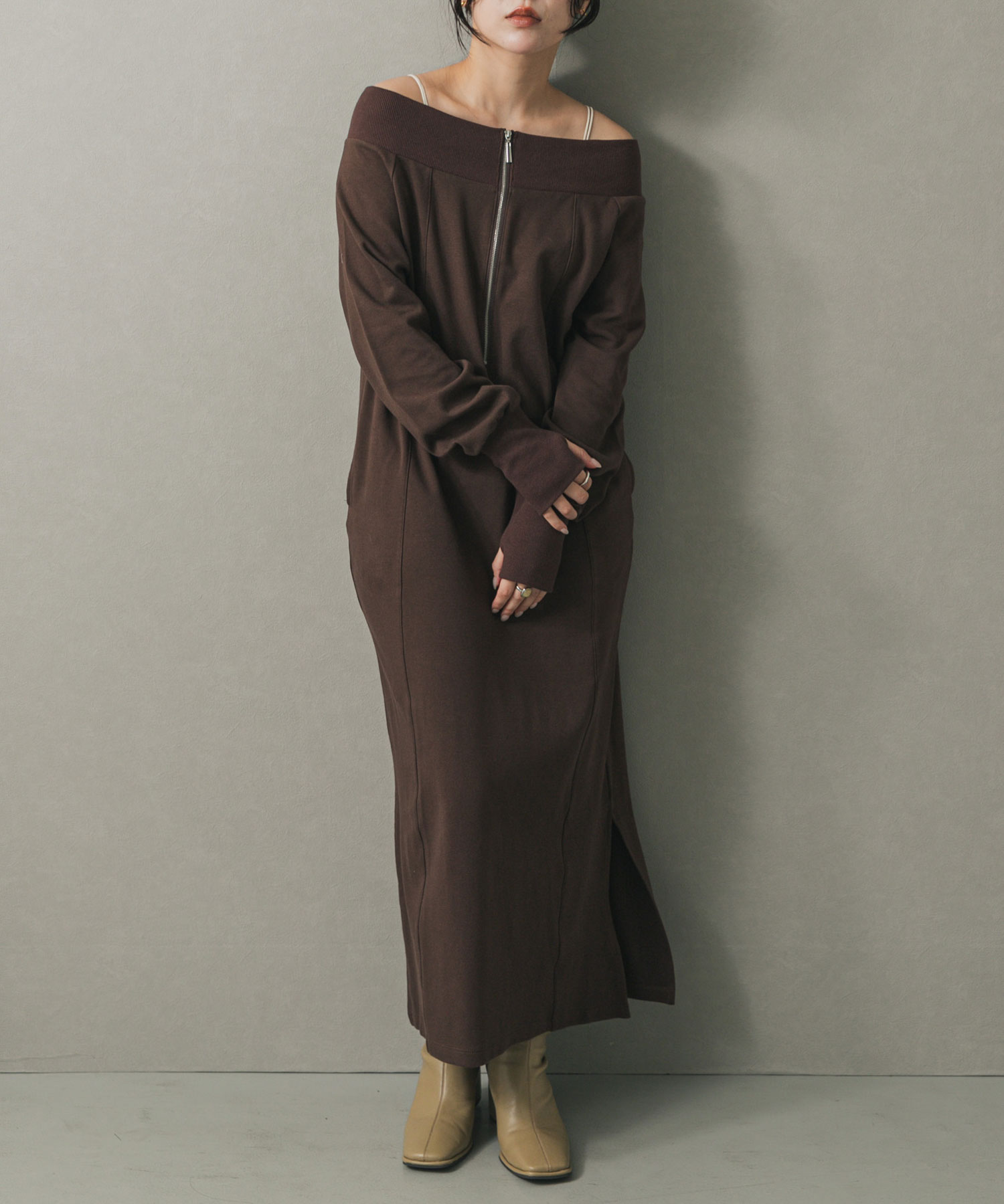露肩半拉鍊洋裝Off-Shoulder Half-Zip Dress