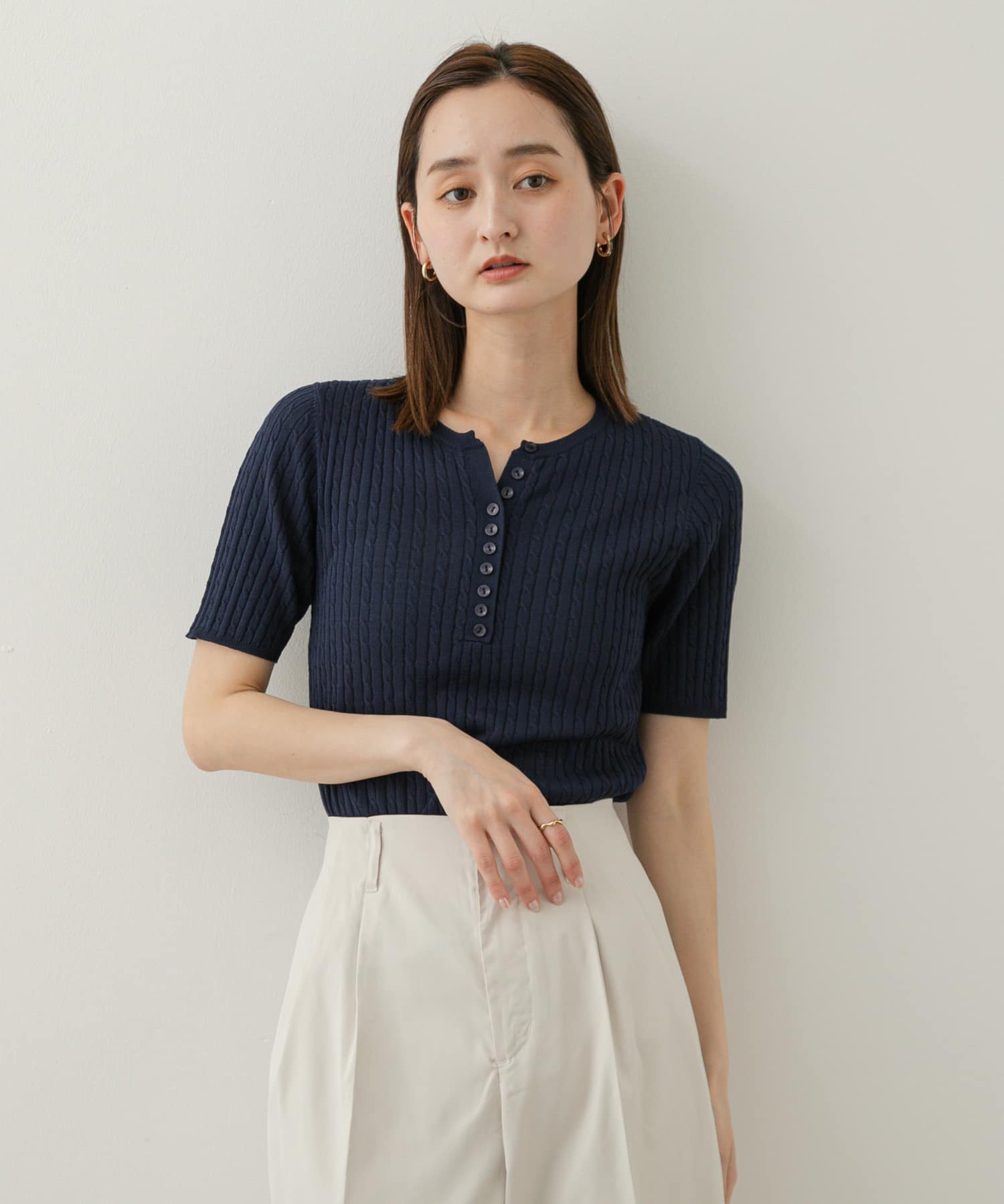 亨利領迷你麻花針織上衣NAVY