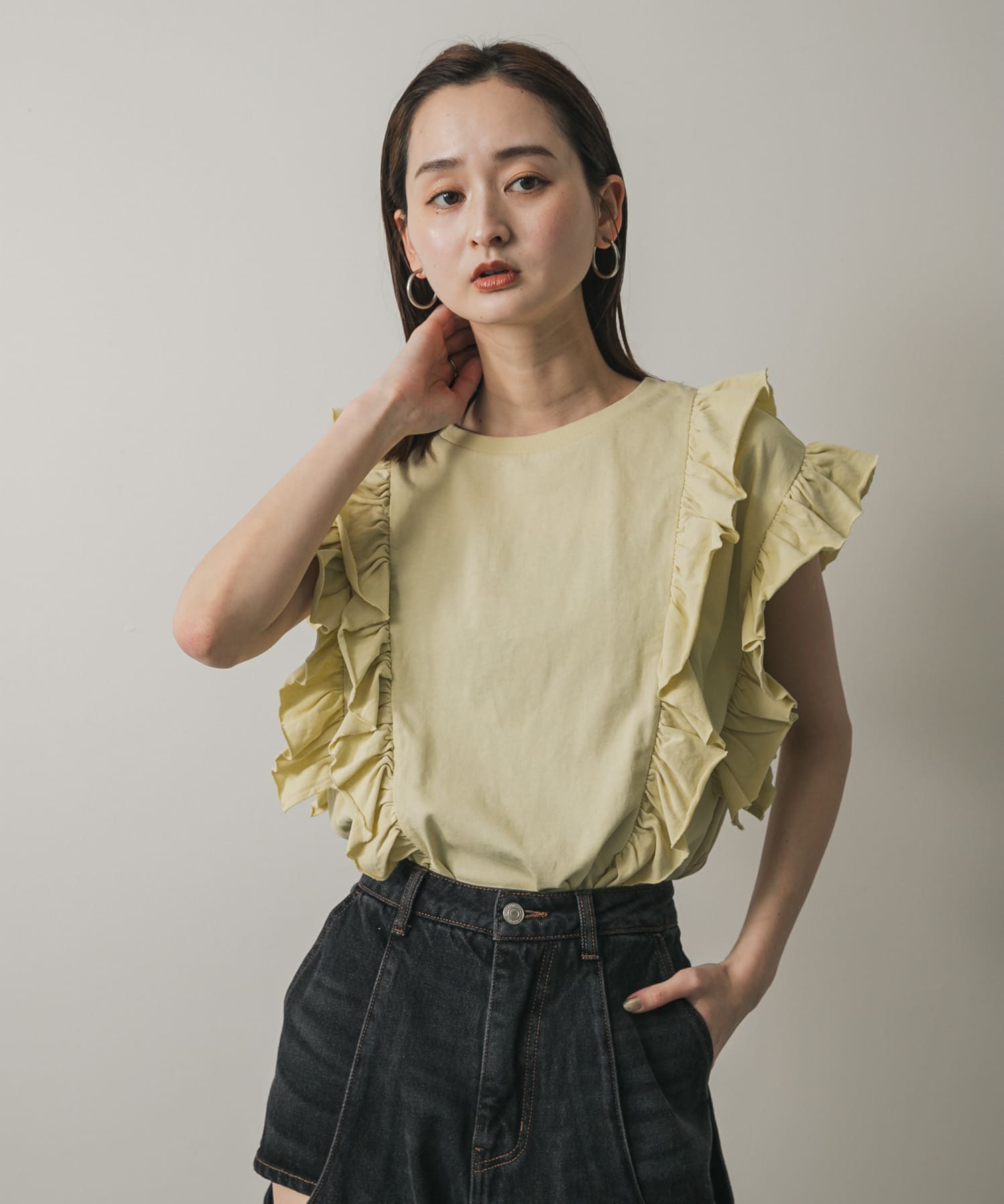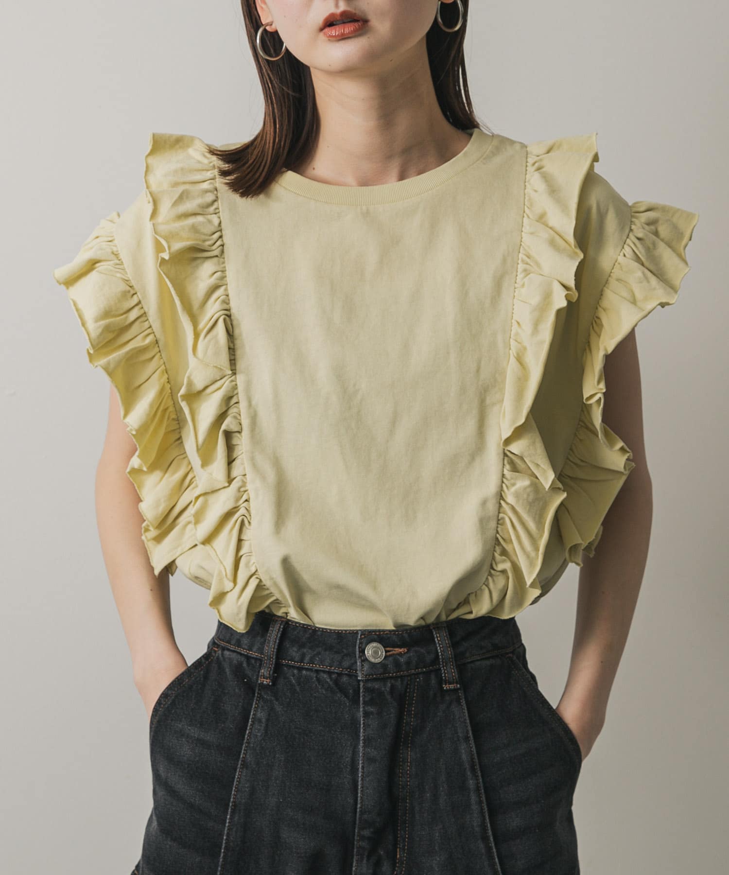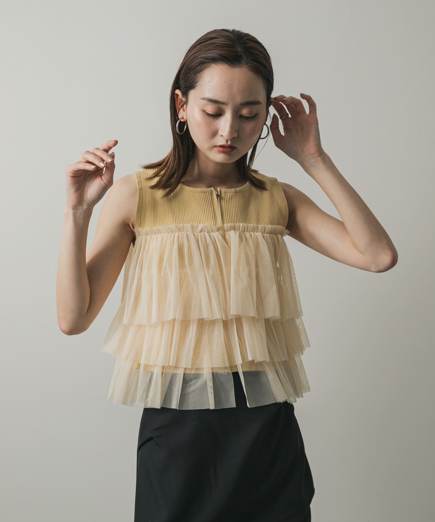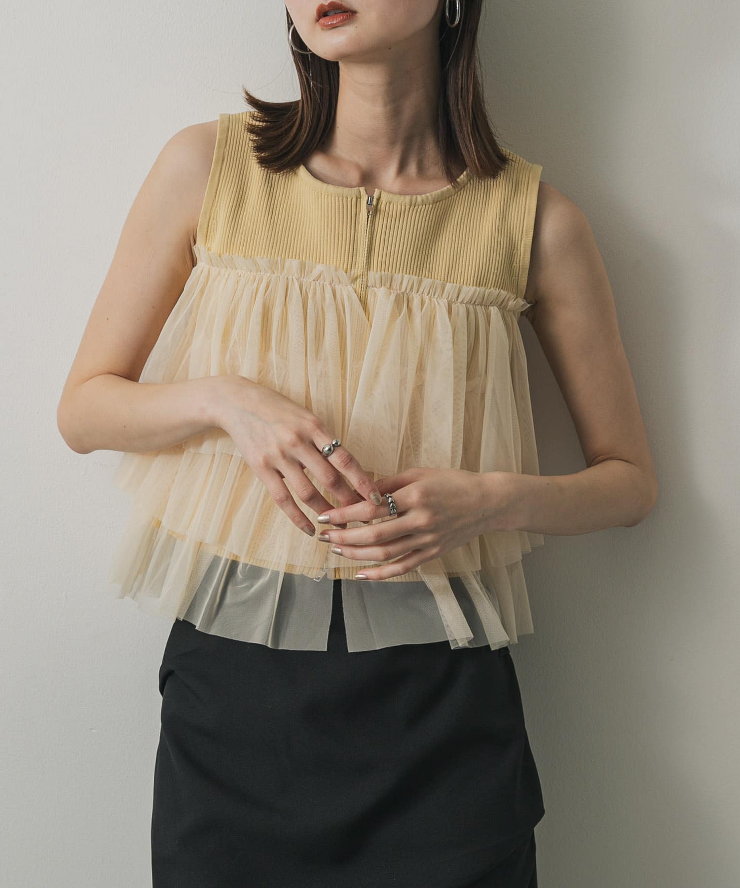 雙拉鍊荷葉邊針織上衣YELLOW