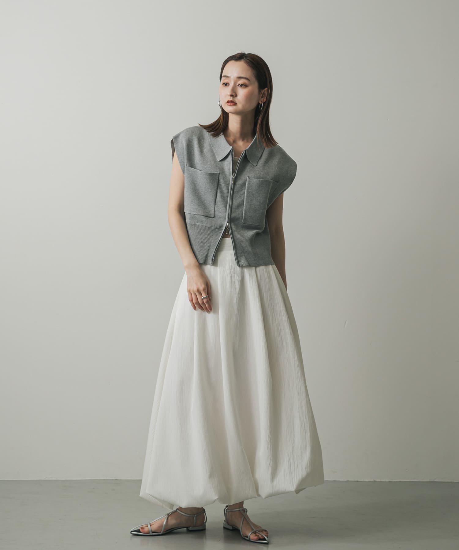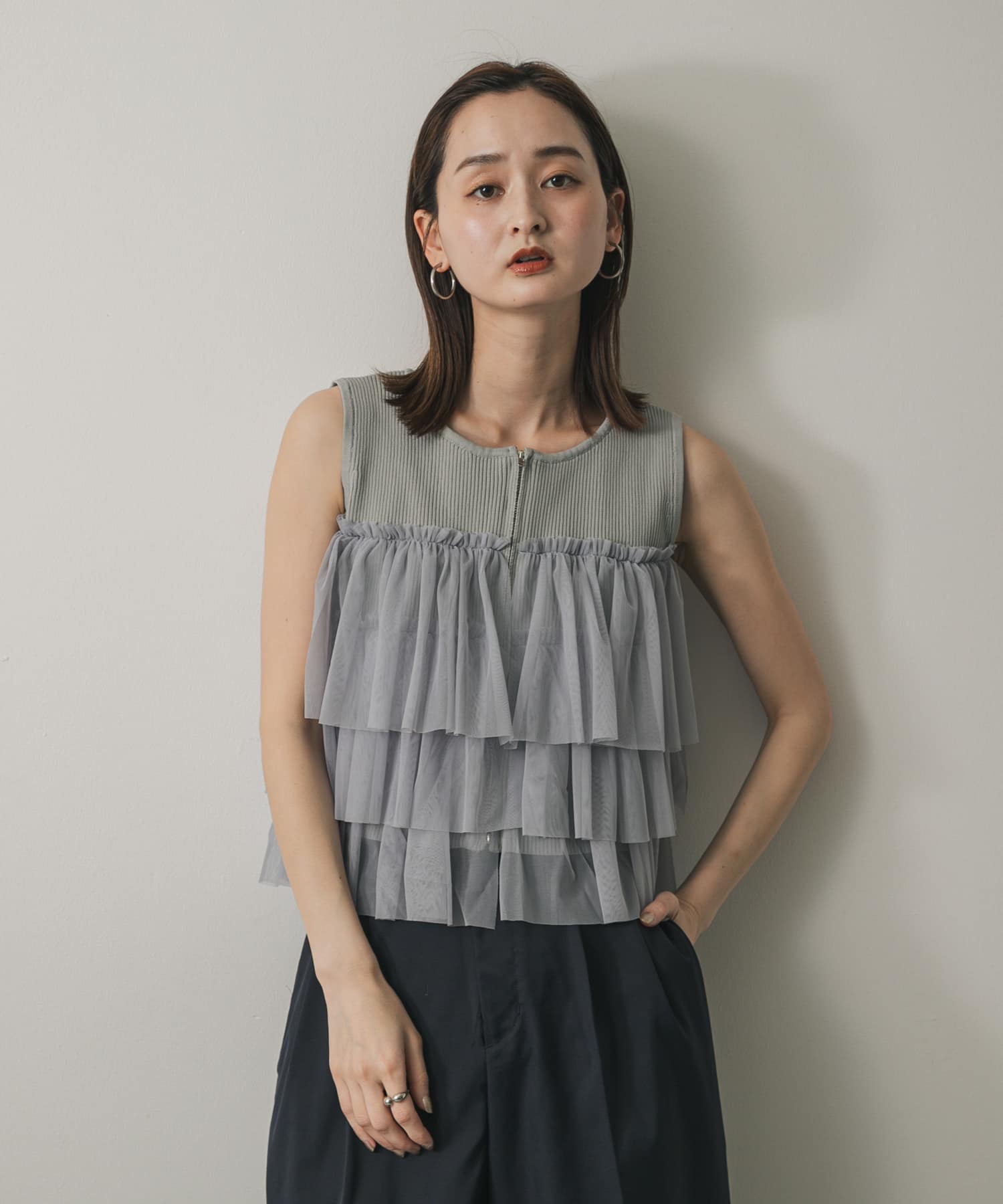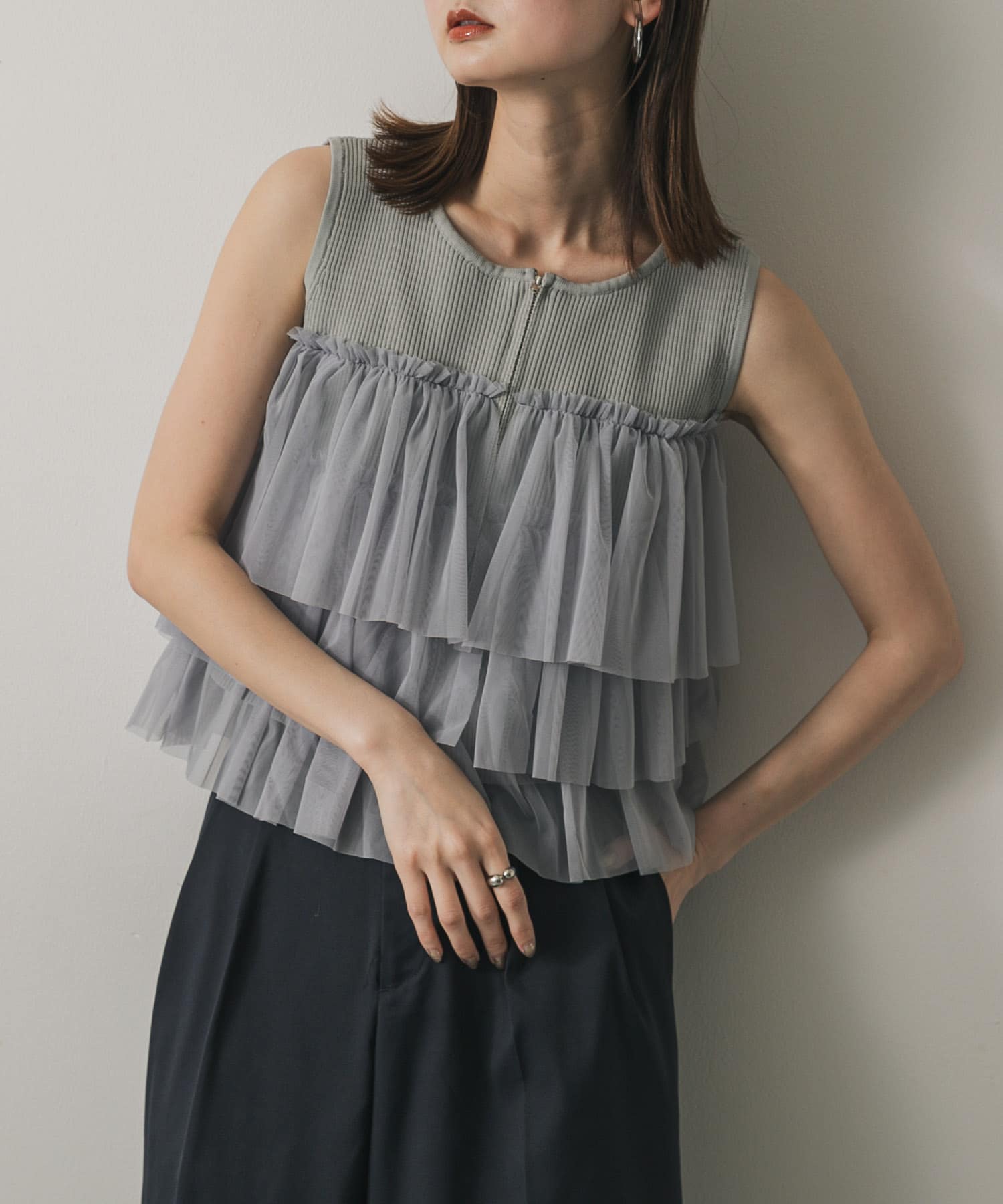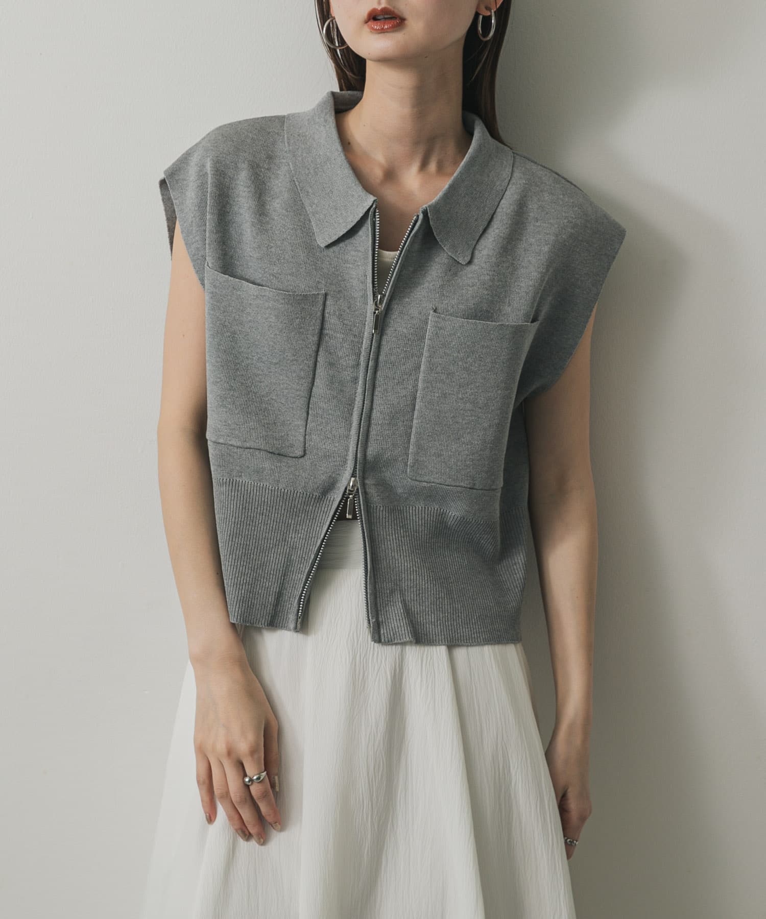 雙拉鍊荷葉邊針織上衣LIGHT GRAY