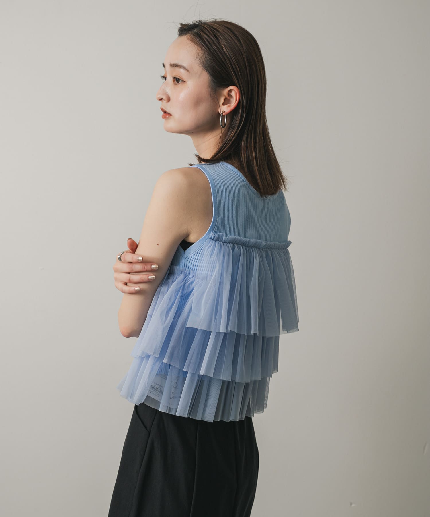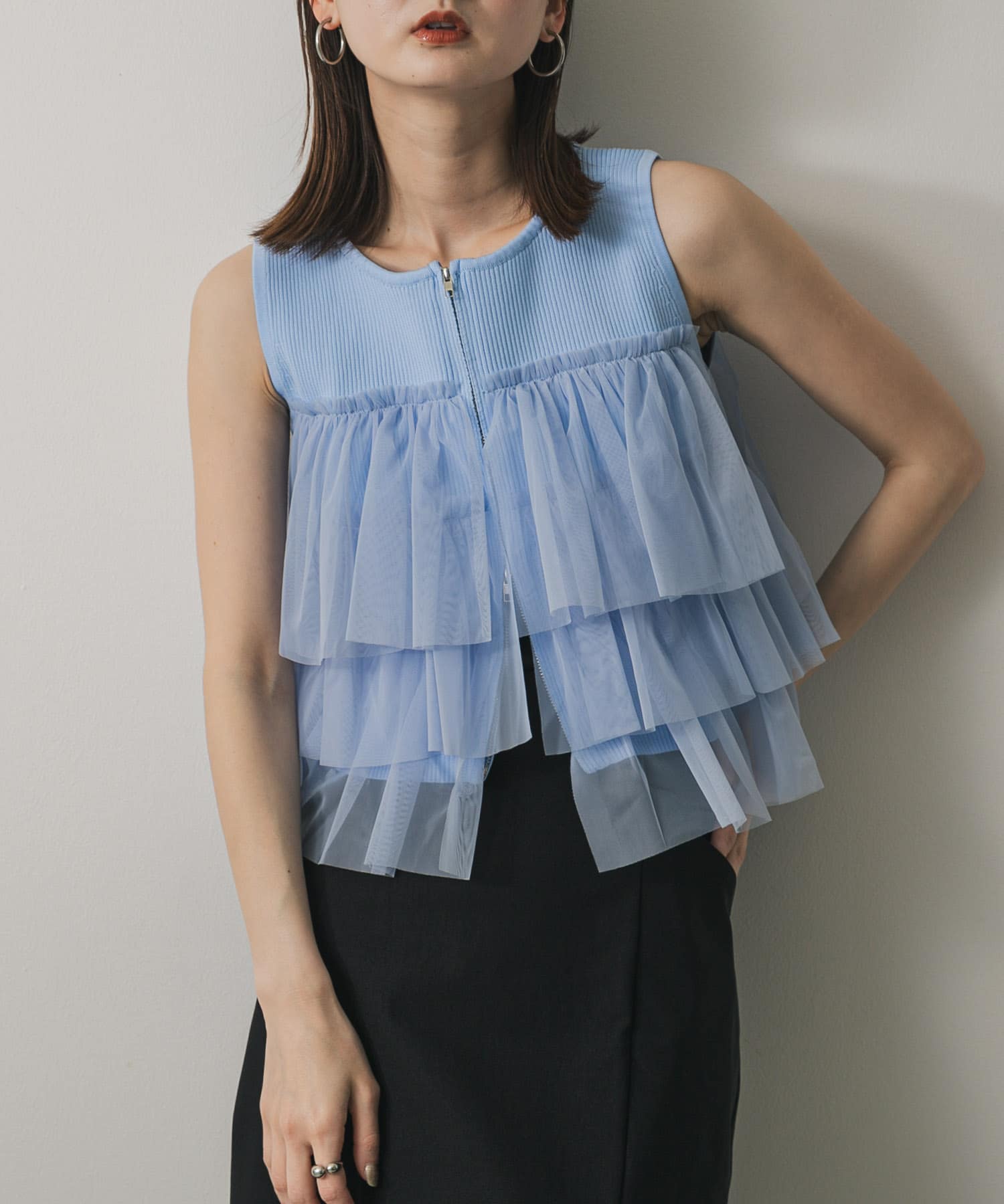 雙拉鍊荷葉邊針織上衣LIGHT BLUE