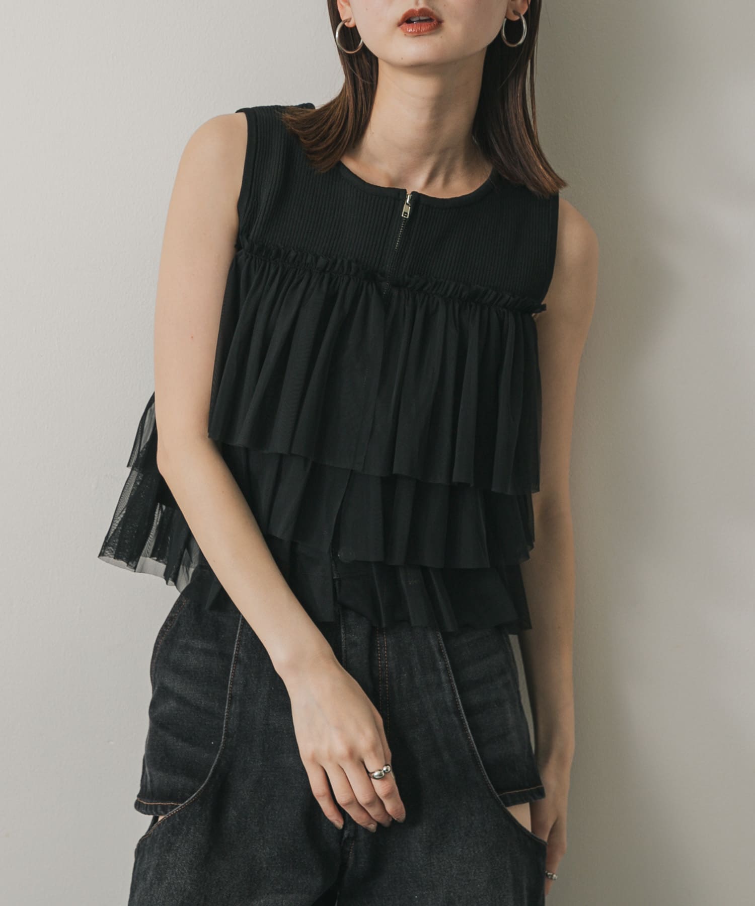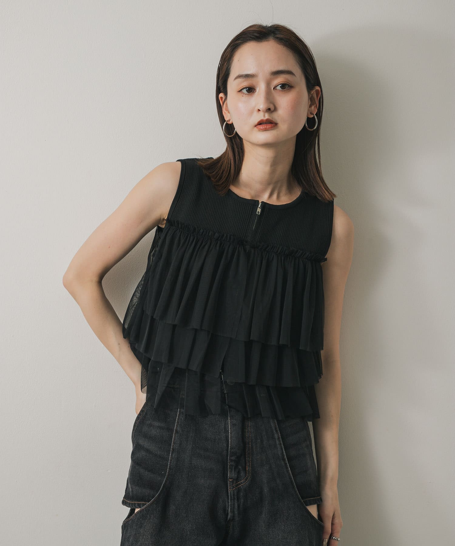 雙拉鍊荷葉邊針織上衣BLACK
