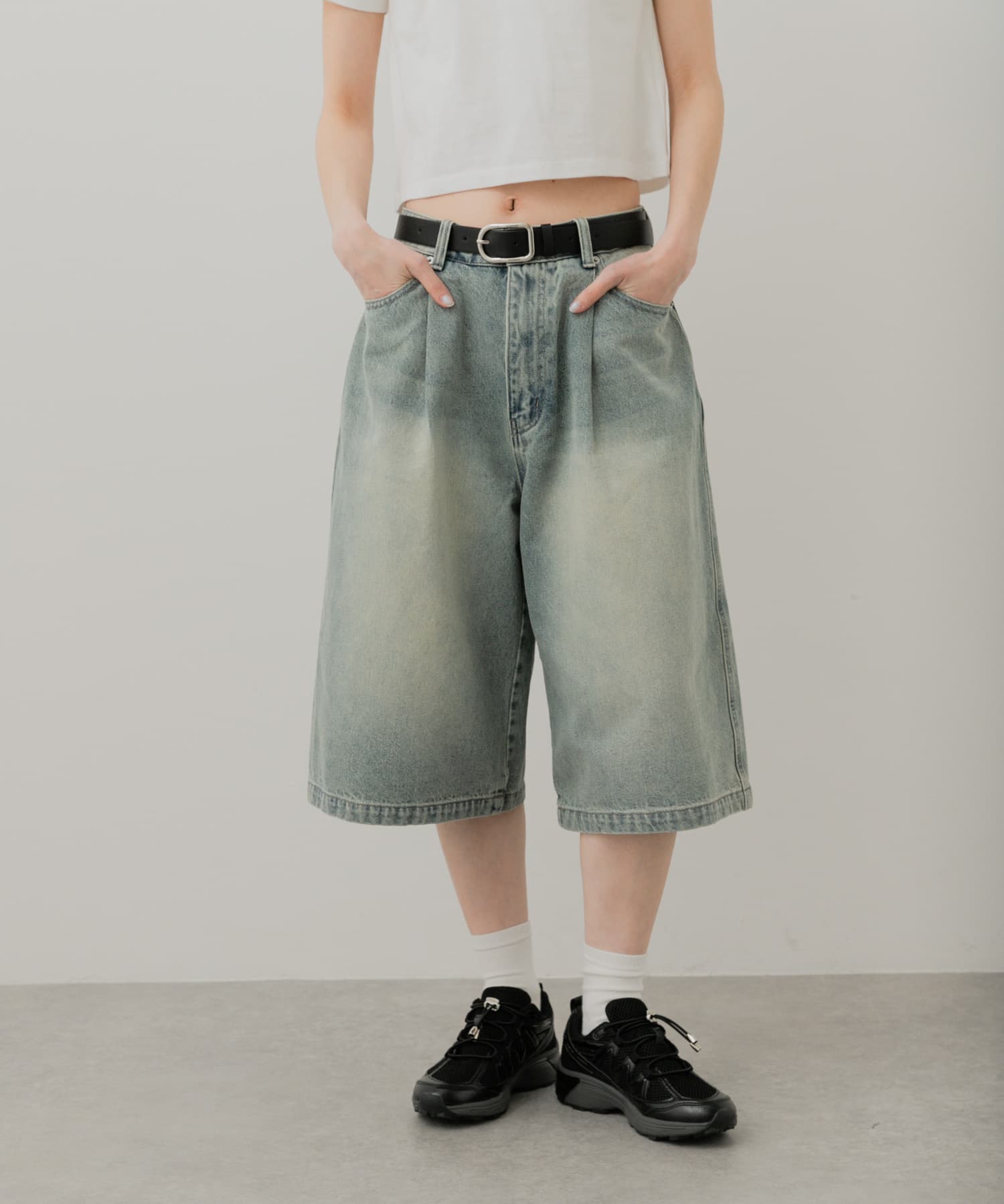 打褶及膝丹寧短褲